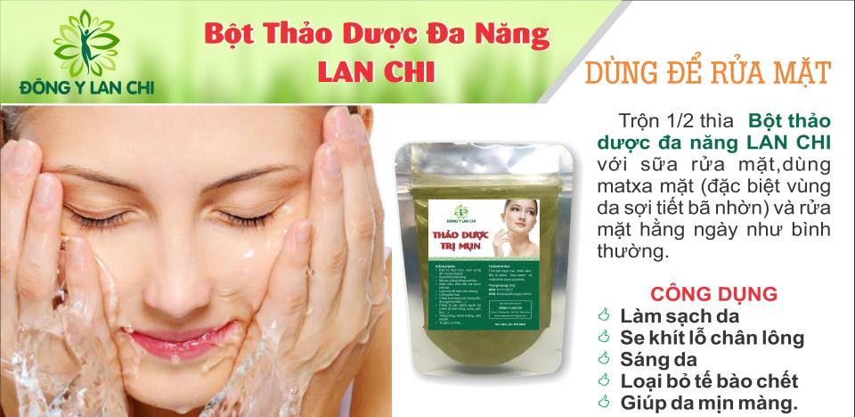 +Trộn 1/2 thìa Bột thảo dược đa năng LAN CHI với sữa rửa mặt,dùng matxa mặt (đặc biệt vùng da sợi tiết bã nhờn)và rửa mặt hằng ngày như bình thường